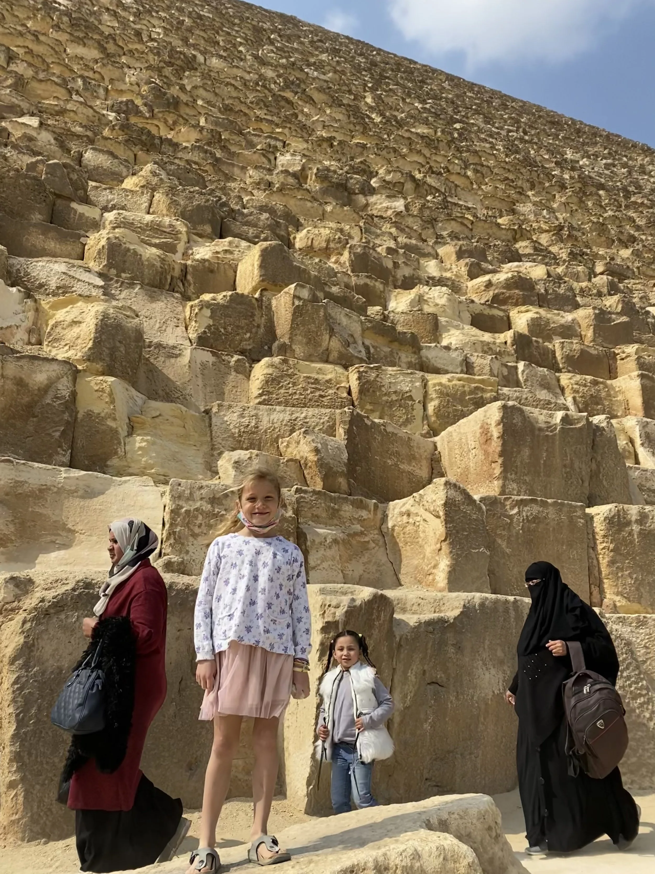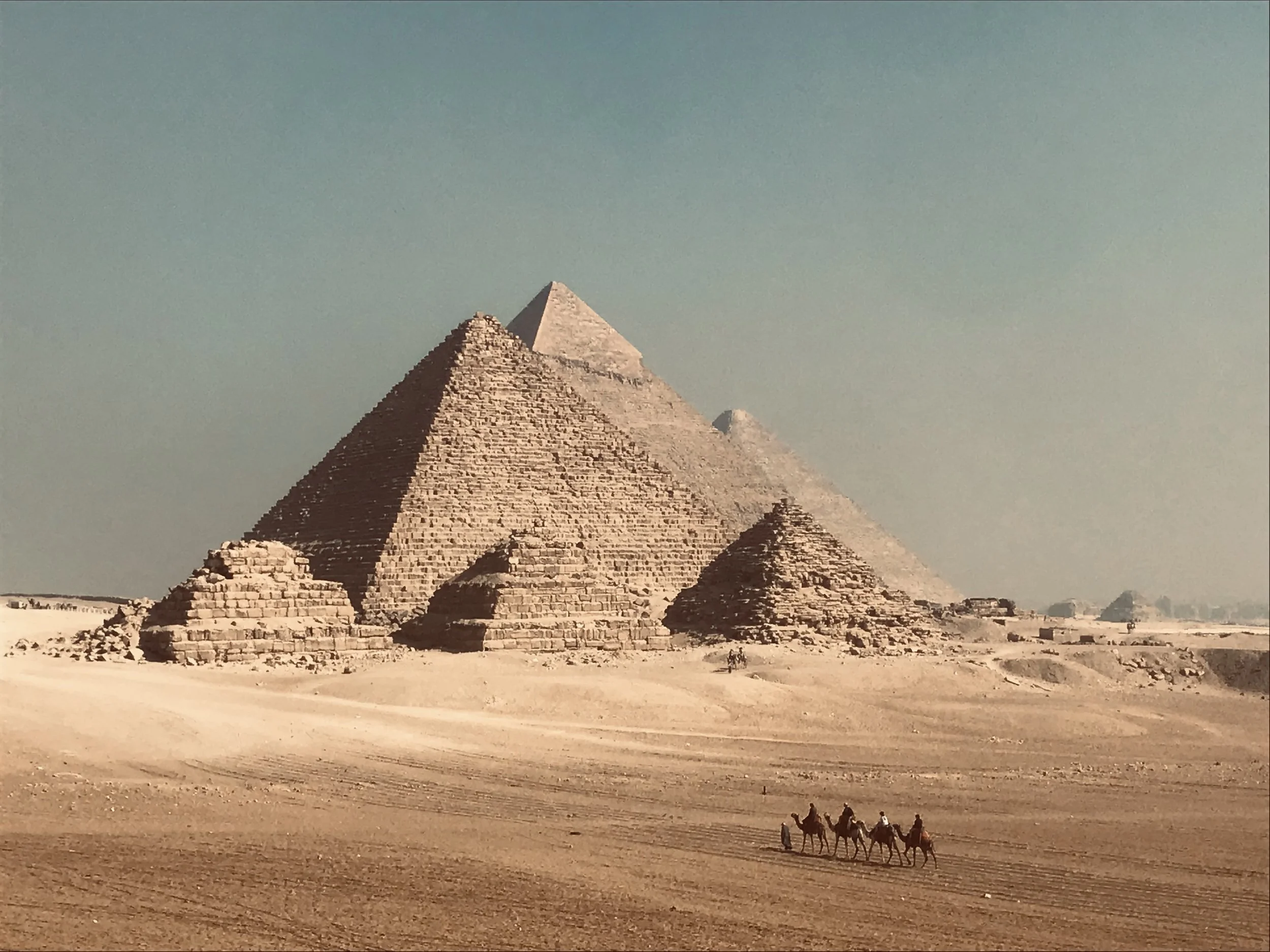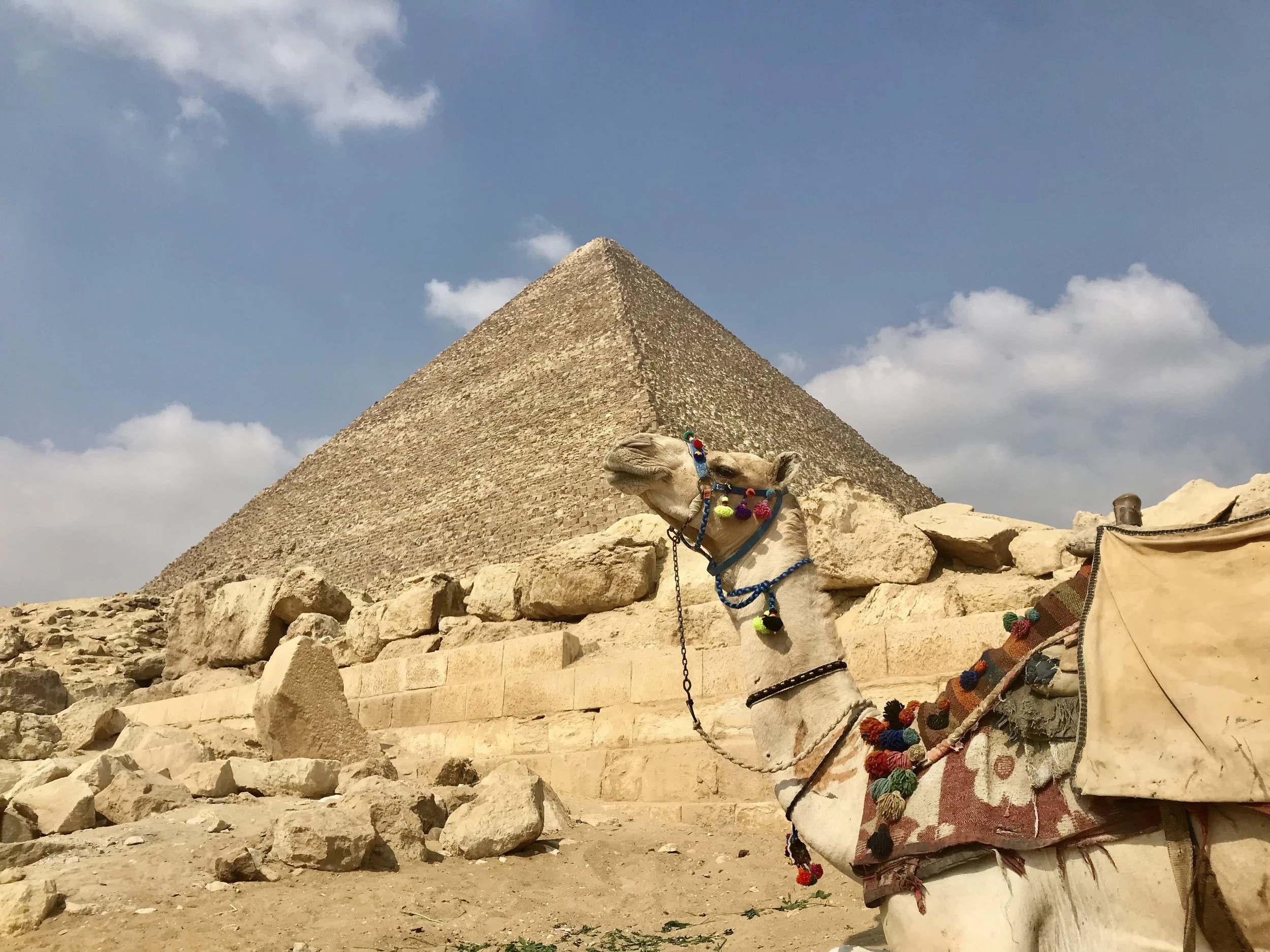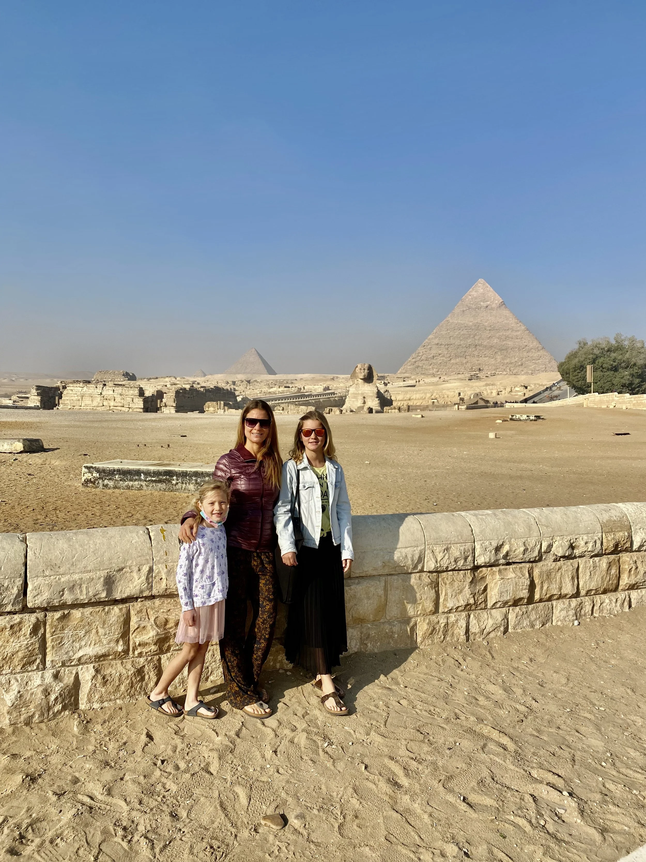 • The Giza Pyramids: world-famous and the only remaining ancient world wonder site, this is a must! We went during the week and early, arriving at 8:30 as it gets busy! There are 2 entrances: the most popular one is by the Great Pyramid and another entrance by the Sphinx. The latter is less crowded and we asked our Uber to drop us off here. There was only one family ahead of us at the ticket office. The ticket office is efficient and accepted our kids as students (1/2 the price. Normally a student card is required, but we were able to get the student discount without the card everywhere in Egypt!) As you walk into the complex you will notice the magnitude of the pyramids. There aren’t any useful signs to guide your visit but you can just walk everywhere (no climbing on the pyramids though!). We ended walking from the sphinx to the Pyramids of the queens, all the way to the Panoramic viewpoint to the west (which offers amazing views!), stopping for a drink at the 9 pyramid lounge and finishing with the most popular pyramids, Cheops and Kahfre. We walked 10km over 3 hours. You can walk everywhere without restrictions. There are many tombs and funerary temples that are interesting to explore as well as just walking around the pyramids and admiring the different angles, sunlight and views was plenty. We did not enter the Great pyramid as we had entered several pyramids in the Saqqara region and had heard it gets very crowded inside the Great temple (and it also costs extra). By the time we left, around 2 pm, it was getting very busy! Finally, there are many options to explore on top of a camel or horse. Personally, we have seen so many abused camels and horses that we decided to boycott these unethical tourist traps. You can read more about that HERE.