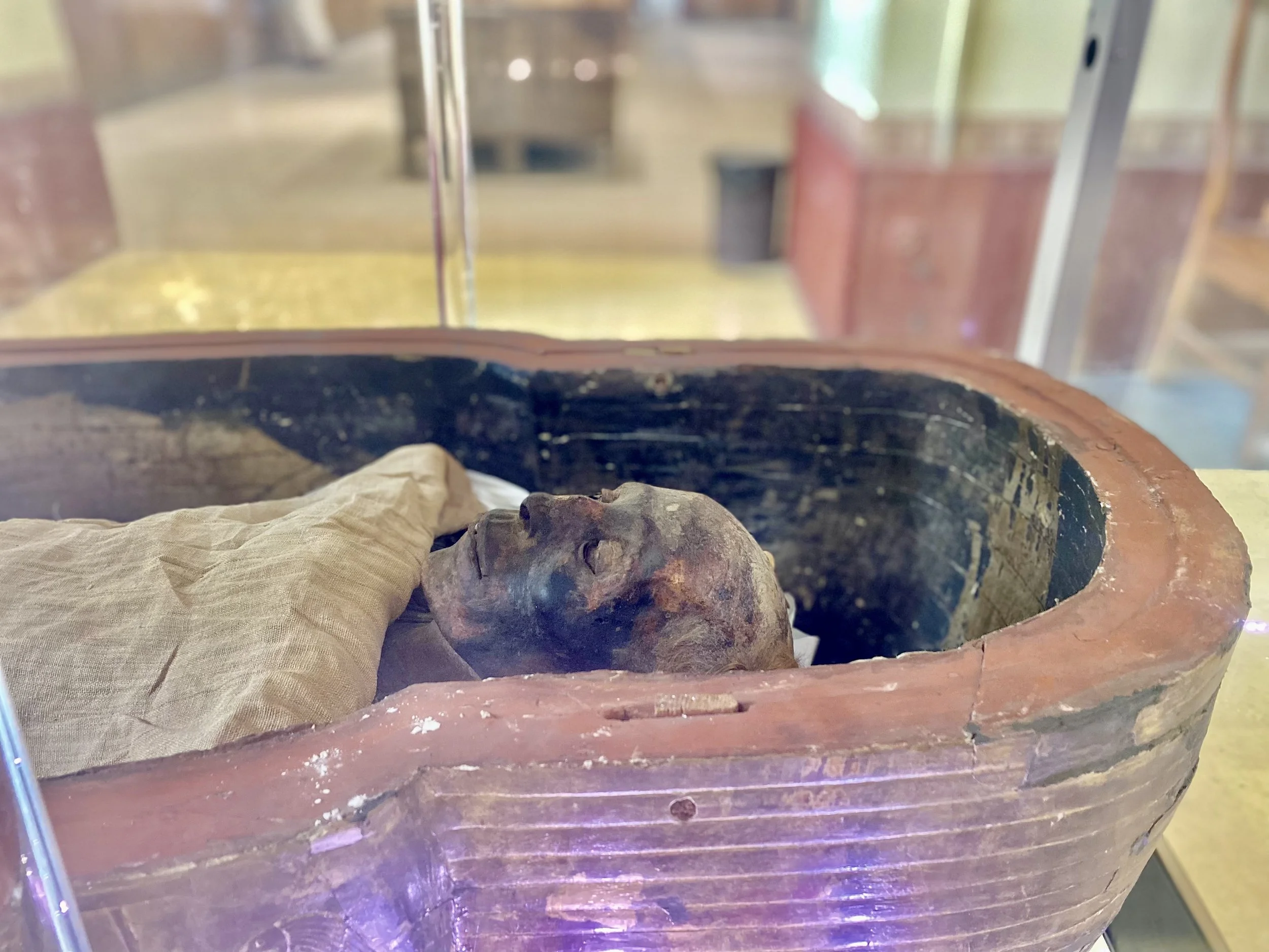 • The Egyptian Museum: Currently the Egyptian Museum is still in one of Cairo’s most historic buildings (from the early 1900s). It is vast and you can easily spend hours, if not days, exploring. They are in the process of slowly moving everything to a new museum near the Giza Pyramids. (Inauguration is estimated for Nov. 2022) You will see many items packed up and ready to be moved, however, as of February 2022 when we went, there was still plenty to see. The highlight here is the golden mask of Tutankhamen and several artifacts found within his tomb. This was very impressive and one of the highlights of our entire trip to Egypt. Besides this, you will also find many other tombs, artifacts, mummies as well as the complete burials of Yuya and Thuya.